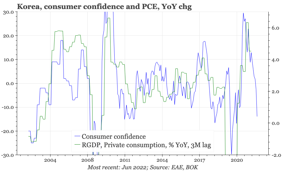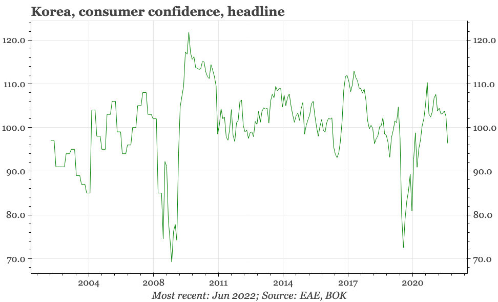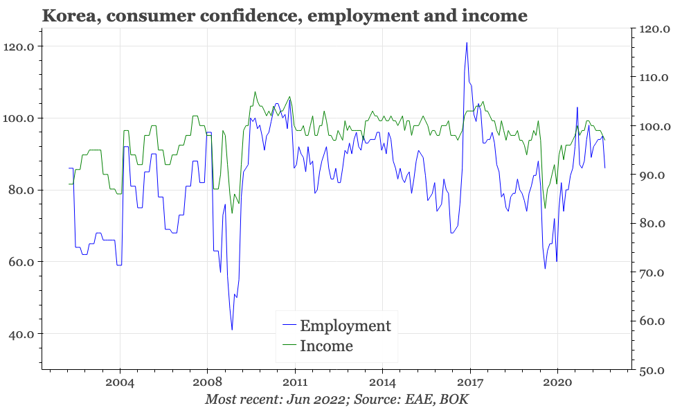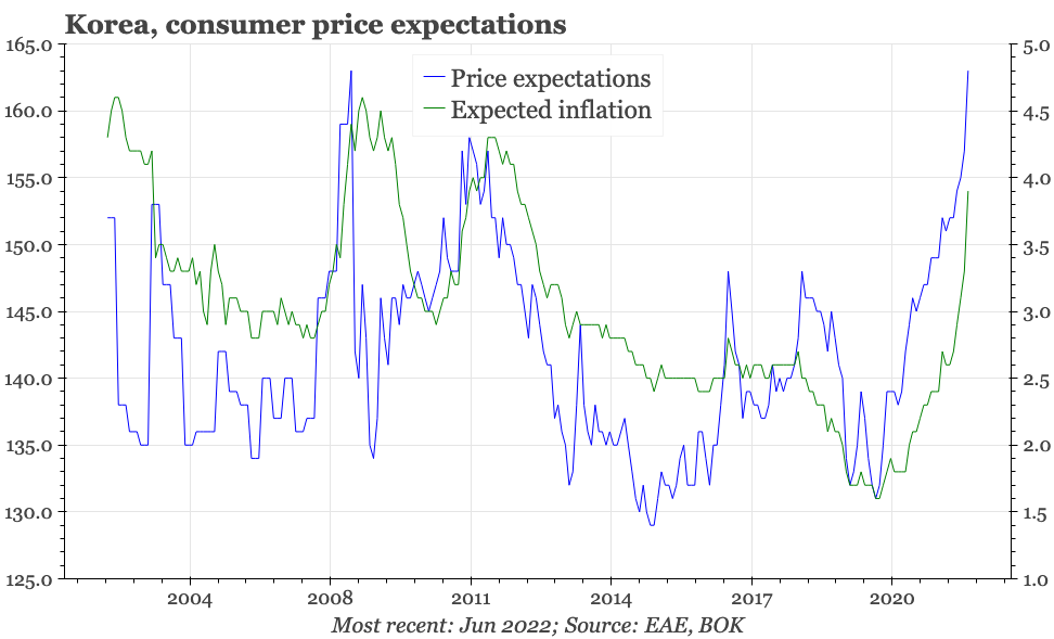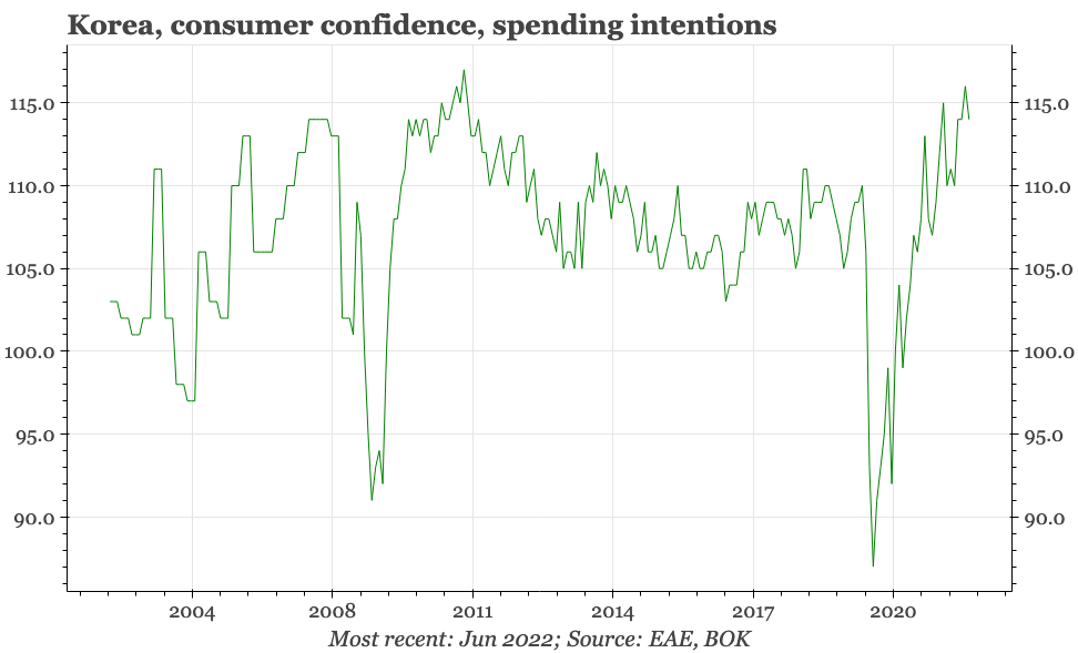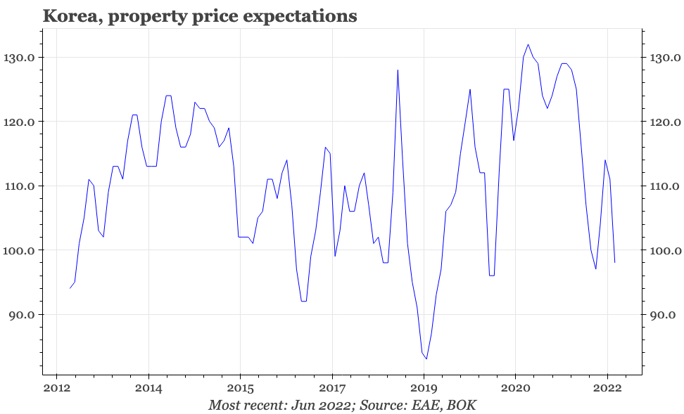 The driver of the weakness in June seems to have been prices; worryingly for the BOK, inflation expectations surged in June, rising 0.6ppts to just under 4%. This, of course, is somewhat backward looking, as consumers react to the rise in inflation that has already happened. Still, it will be a worrying development for the BOK, with the fall in property price expectations in June only providing a little consolation.