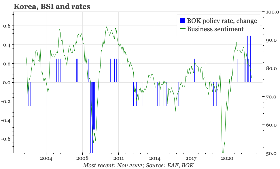 It didn't quite there yet in November, but in the next couple of months business sentiment will most likely be back at levels where, far rather than hiking 50bp, the BOK has historically been cutting.