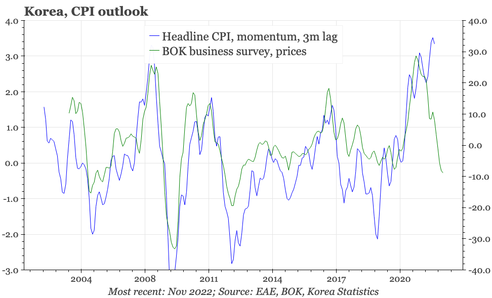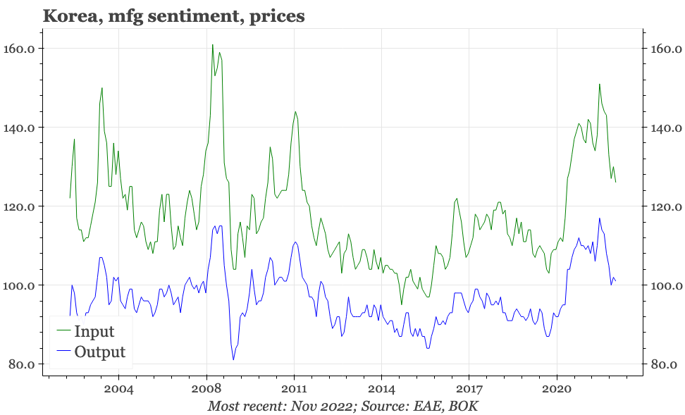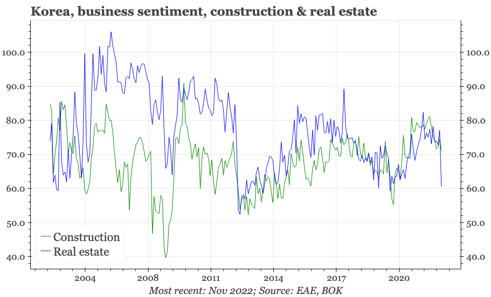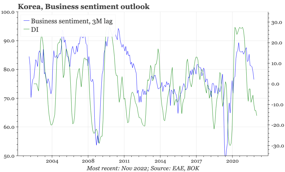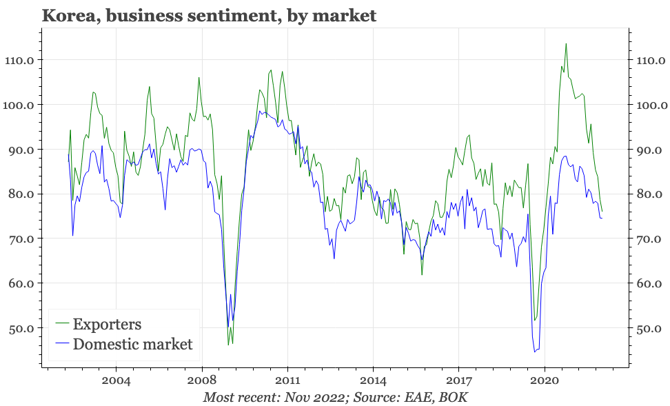 The weakness continues to be led by companies selling outside of Korea, with exporter sentiment in November (the survey includes a 1M outlook) down to 76. That is quite the fall from the almost 115 recorded in mid-2021. The decline in exporter sentiment has been lagging the weakening of actual exports. Our regional model continues to point to more downside for exports: it is currently indicating exports will be falling 15% YoY in the next few months.