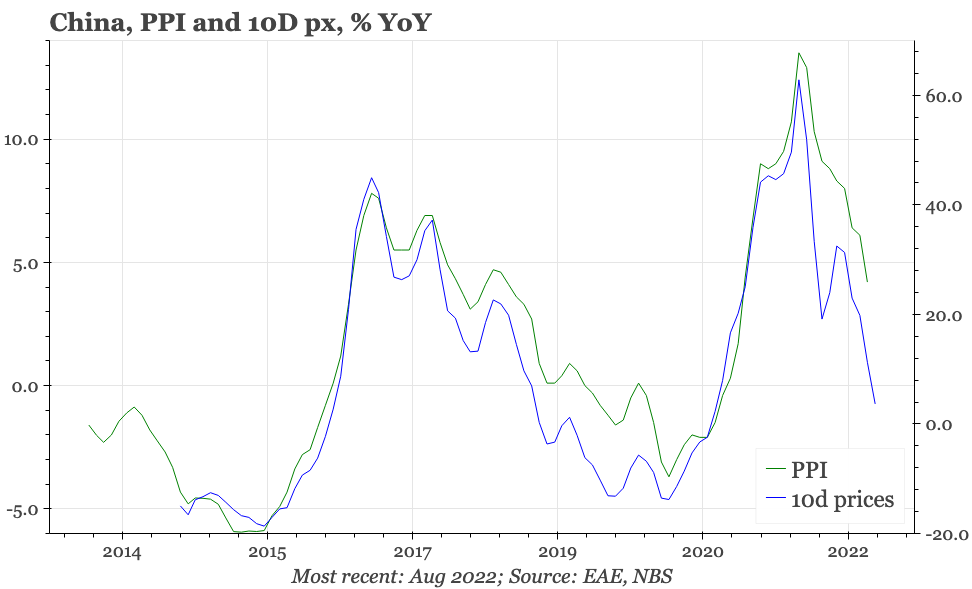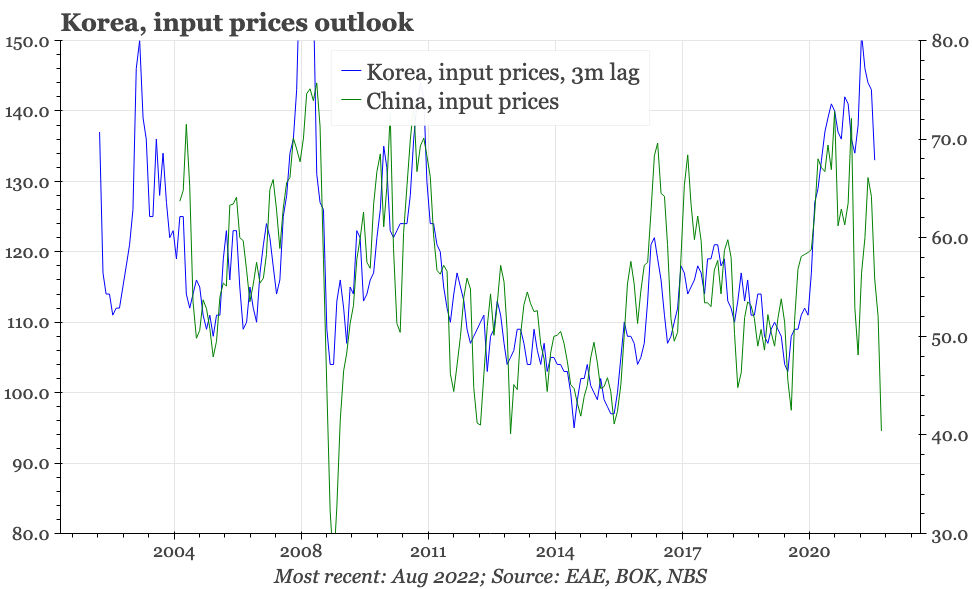 The continued fall in upstream inflation in China is important for the rest of the region: as an example, Chinese input prices tend to lead those in Korea. But the deflationary trend in China should also have implications for the rest of the world.