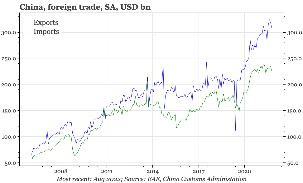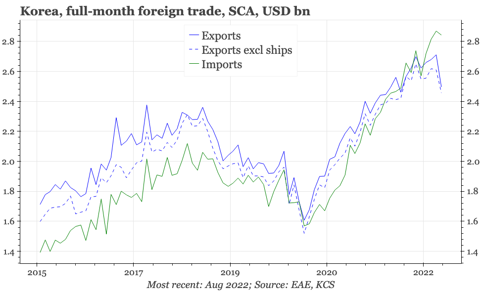 The Japanese data for August on Thursday will complete the export picture for the region. There's also machine orders and the MOF's quarterly survey, which will set the scene for next month's more comprehensive BOJ Tankan. On Friday, China will release activity data for August. They likely won't do much to change our understanding of the economy. Also worth watching for next week will be labour market data in Korea, and wages in Taiwan.