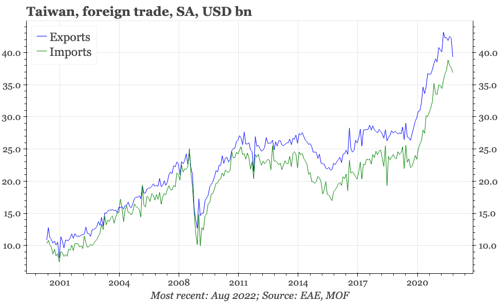 Taiwan's exports fell sharply MoM in August, matching the deterioration seen in the Korean export data that were released a few days earlier. Leading indicators continue to point to more downside ahead. Inflation in Taiwan has likely peaked, and should decline in the coming months. The two risks around that are first, rising food prices, and second, cost inflation in services. There are reasons to think that services price might rise further from here, but for now, that seems like a tail risk.