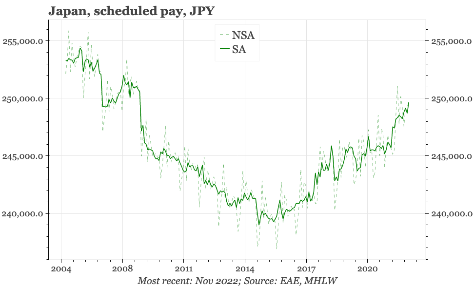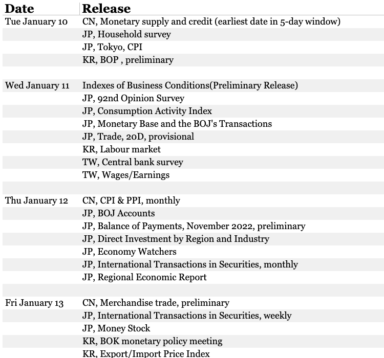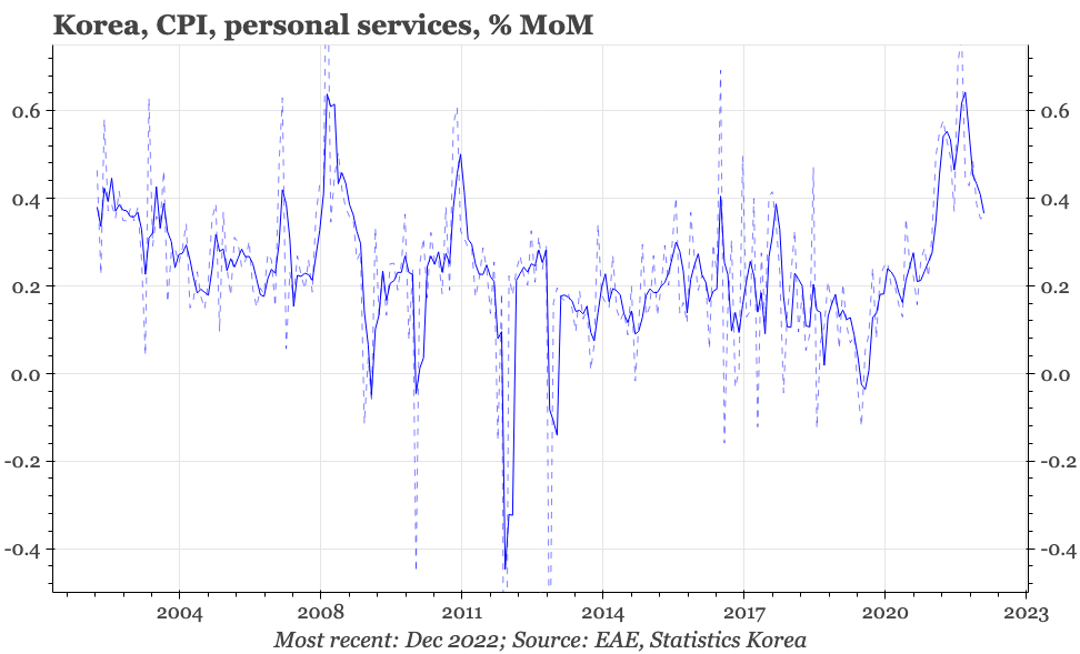 The policy highlight is the BOK meeting. We are working on a preview of that, which should be done in the next couple of days. China will start to release official indicators for December. PPI inflation should have continued to bottom, but core CPI will likely have remained very soft. The monetary data are a bit more uncertain. The government would have tried to push more credit growth, but banks will be wanting to wait for January. M1 might be a bit better, given data this week showed a (slight) tick up in household liquidity preference in November. In Japan, Tokyo CPI for December will be important, in particular whether the rise in services inflation is continuing.