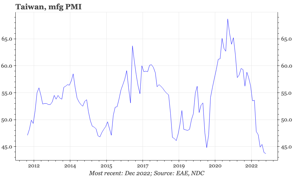 The December PMI shows Taiwan's manufacturing sector remains in recession, with signs of a floor tentative at best. So, right now, it looks like growth and inflation will slow further in Q1. The upside risk is what happens to regional demand as the current covid wave recedes in China through Q1.