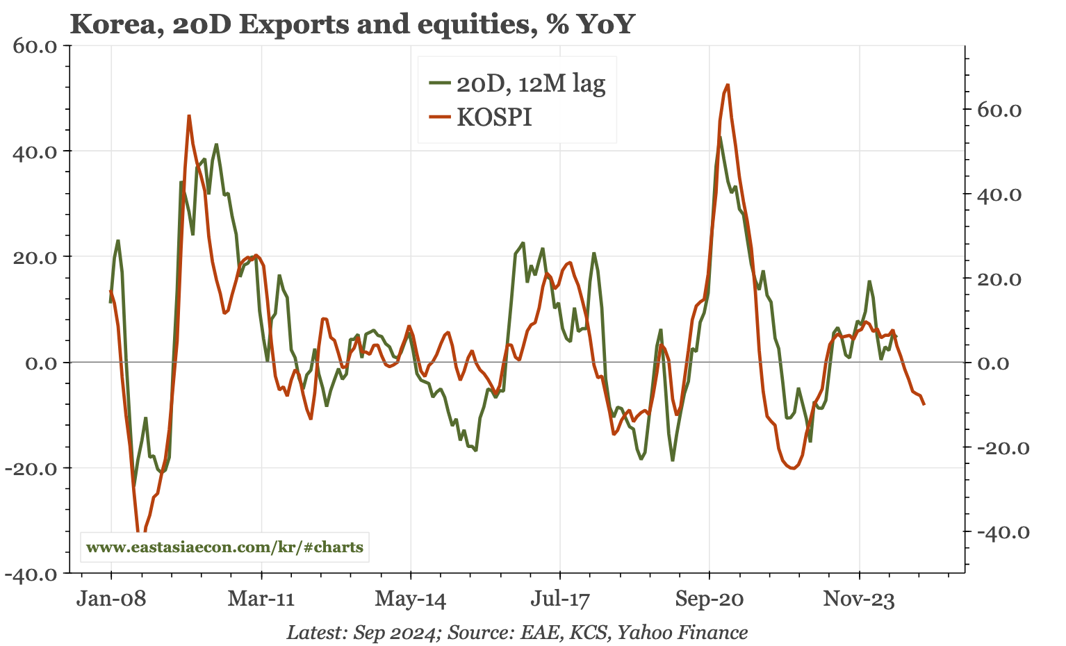 My leading indicator suggests a clear rolling over of the export cycle even before the real hit from tariffs begins. It might be a bit too early yet for that hit to be showing up in hard export data, but next Monday's trade statistics for Korea for the first 20 days of April will be a test.