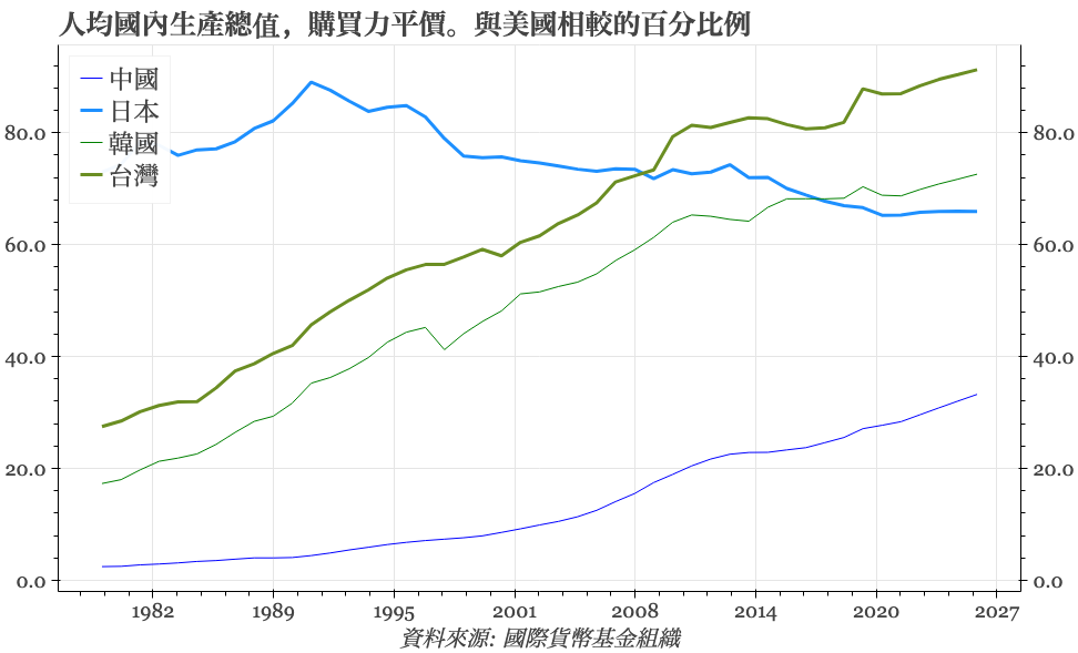 可是事實並沒有那麼單純,其實可以說是完全相反。根據第二張圖片顯示的,台灣的平均收入並不低,不但領先其他亞洲國家,甚至快趕上美國。這張圖片的衡量標準是購買力,這個概念是生活水平除了收入之外也取決於生活成本。換句話說,雖然三萬台幣只能買一千美金,但在生活成本低的台灣,三萬台幣的價值其實高於在美國的一千美金。這也是這兩張圖片所反映出的事實。