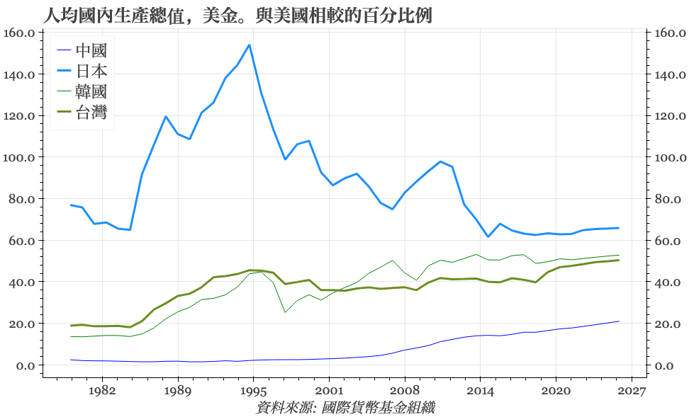 為了了解收入和匯率的關聯,我想用兩張圖片加以說明。第一張是以美金來計算的人均國內生產總值,從這張圖可以看出台灣的收入只有美國的百分之五十而已。這種情形好像具體地表現在我們常聽到的抱怨,比如畢業生的收入低於一千美金,台灣不是寶島而是鬼島等等。