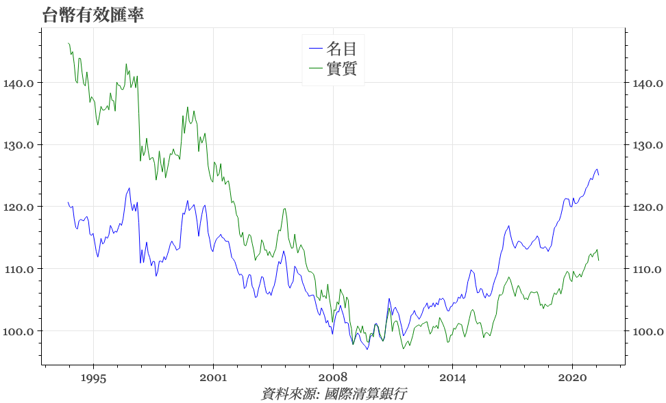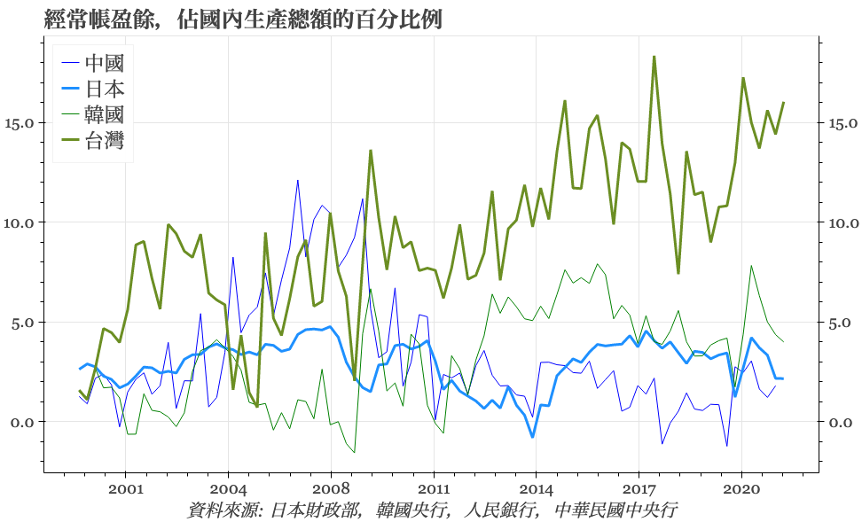 當然,不只是一般人享受低成本的好處,一個國家的平均價格也會影響公司的國際競爭力。第三張圖片表示所謂的經常帳盈餘,顯示一個國家進出口金額的差距。台灣能維持不斷高企的經常帳盈餘意味著出口企業競爭力強。這些企業在國外的營收不斷轉回國內,應該促使台幣升值,可是最後一張圖片顯示最近幾年台幣價值的波動並不大。增加也是美國政府對台幣匯率不滿的原因其中之一。
