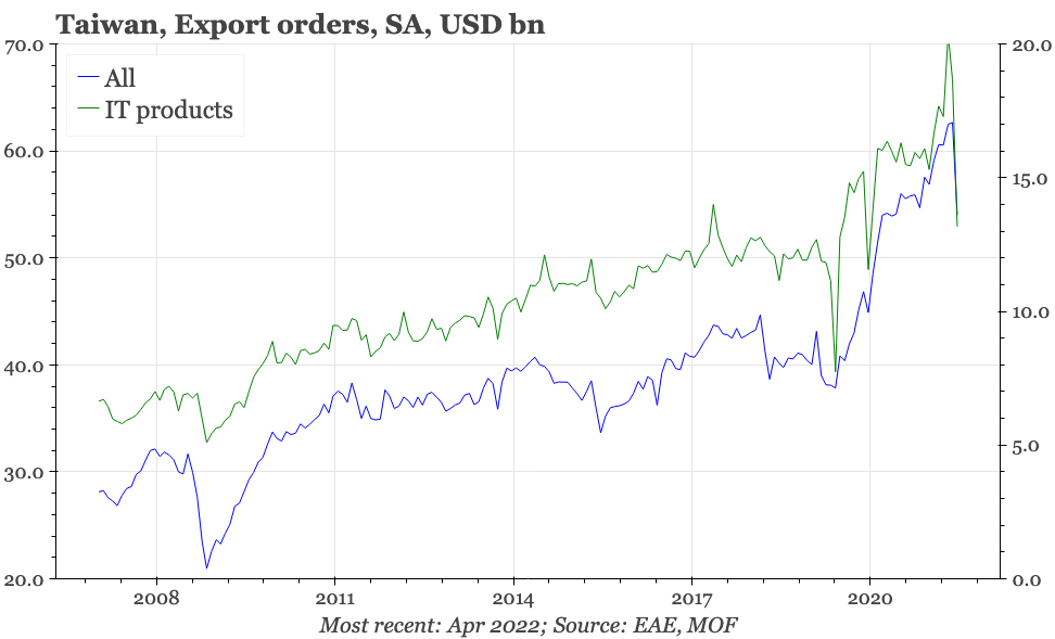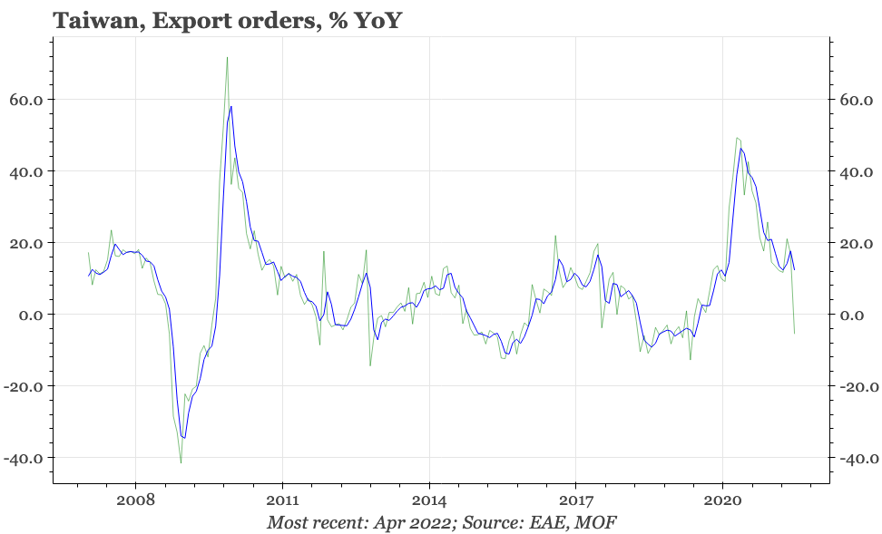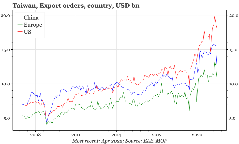 Taiwan export orders aren't necessarily a great leading indicator, but they are one of the measures that tells us about the state of the Asian export cycle. As a result, the sharp fall in April is important. There is already clear evidence that the Asian cycle is past the best, but the pronounced decline in Taiwan's export orders in April is the first indication that the cycle is cracking rather than just moderating. The lockdowns in China are certainly part of the reason, and they will be eventually lifted. But orders to the EU in particular, and also to the US, were weaker in April too.