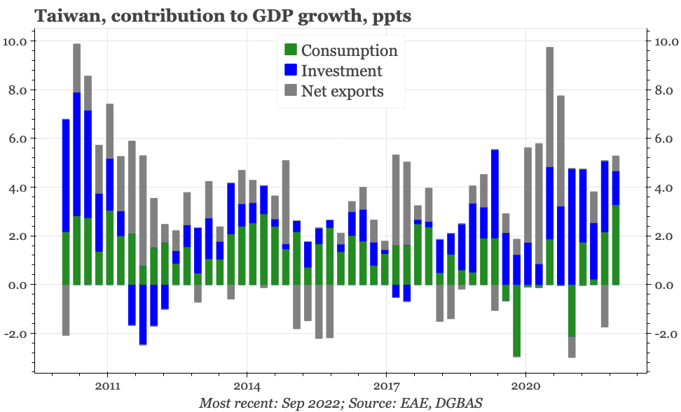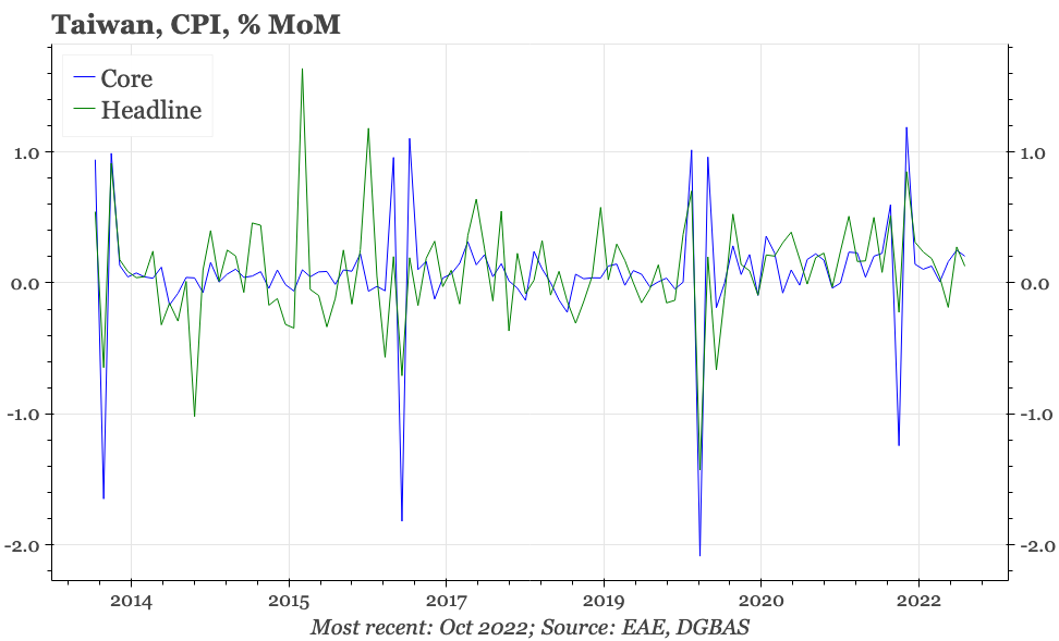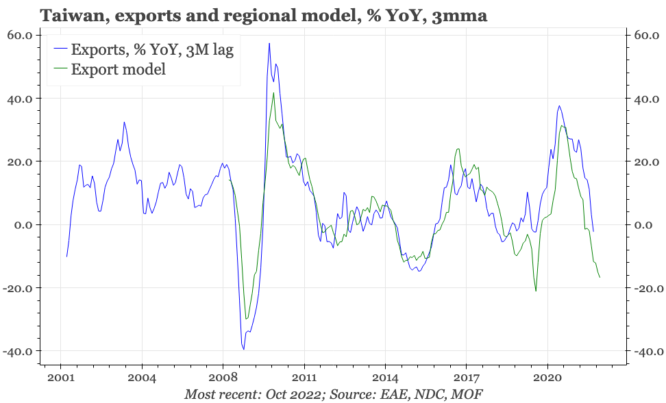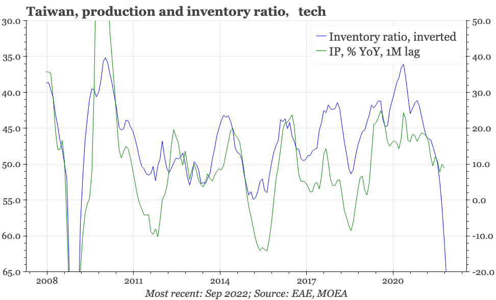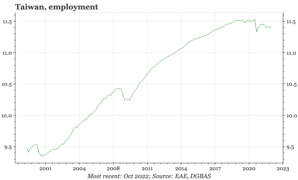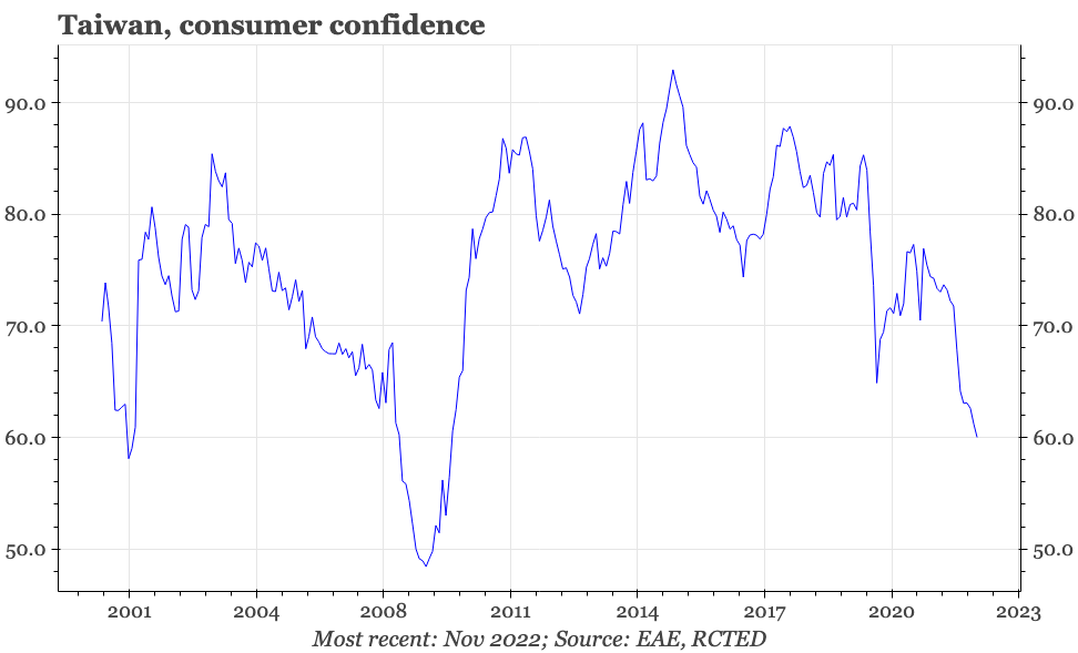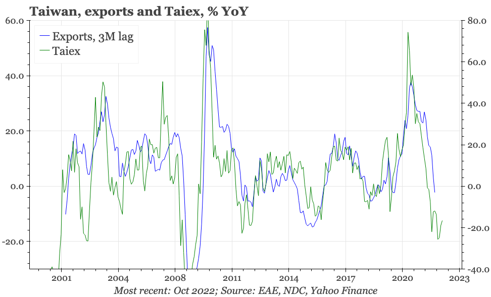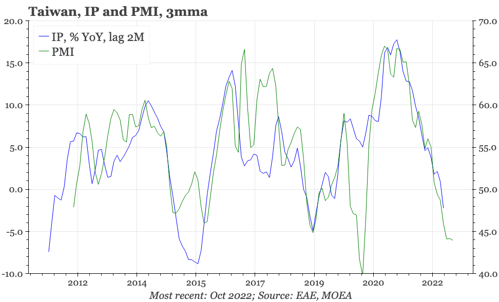 This is because it is the dramatic cyclical slowdown in mainland China that has been the biggest driver of the sharp deterioration in Taiwan's exports. The authorities in Beijing now look increasingly keen to bring that economic pain to an end, announcing policies to end the property squeeze, and to offer a path out of zero covid. These are important changes, particularly because they are happening at a time when some of the economic indicators in Taiwan, while not improving, have shown tentative signs of not worsening further.