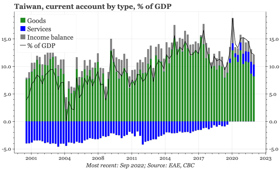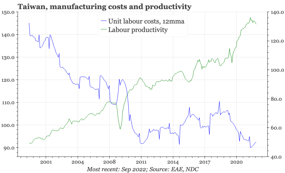 With the current account surplus going into the pandemic so big, Taiwan's international competitiveness was already sharp. With the flip side to the rise in labour productivity being a fall in unit labour costs, there is certainly no reason to think that competitiveness is now being eroded. The external surpluses have deteriorated as the import fuel bill surged. But unlike in Korea and Japan, Taiwan's trade balance has remained firmly in the black, and that in turn kept the current account surplus at more than 10% of GDP in Q3.