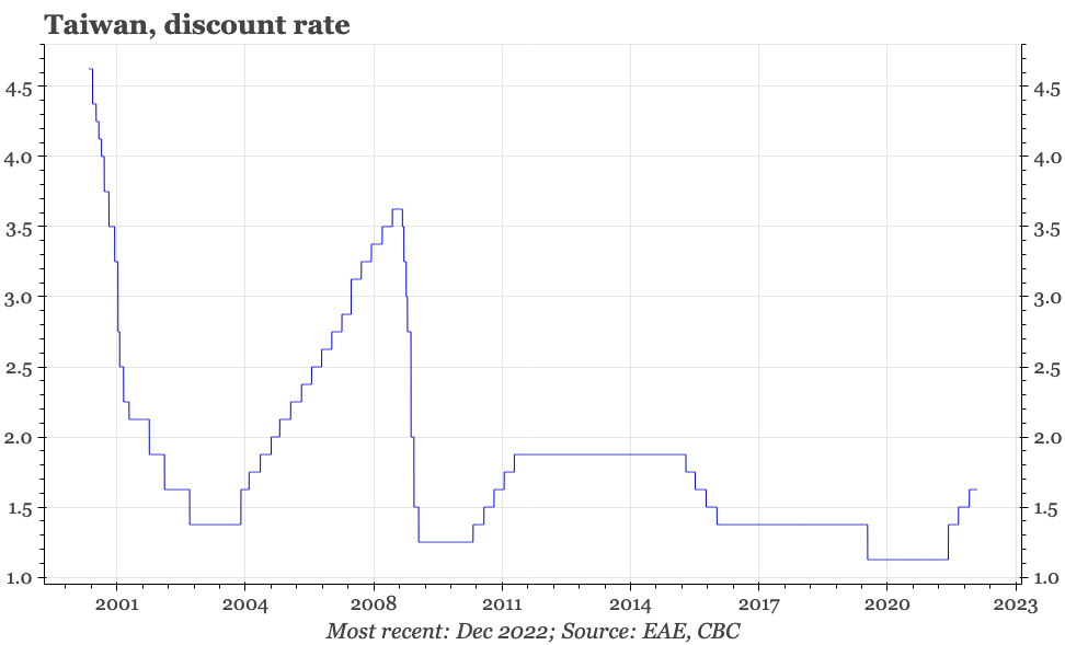 Corresponding with the modest rise in inflation, tightening by the CBC, Taiwan's central bank, has been restrained in the last couple of years: the last hike in September took the policy rate to 1.6%, up from 1.1% in March. With exports now contracting and inflation likely to have peaked, the question so not whether rates go higher from here, but whether the CBC will be the first to central bank in the region to cut.
