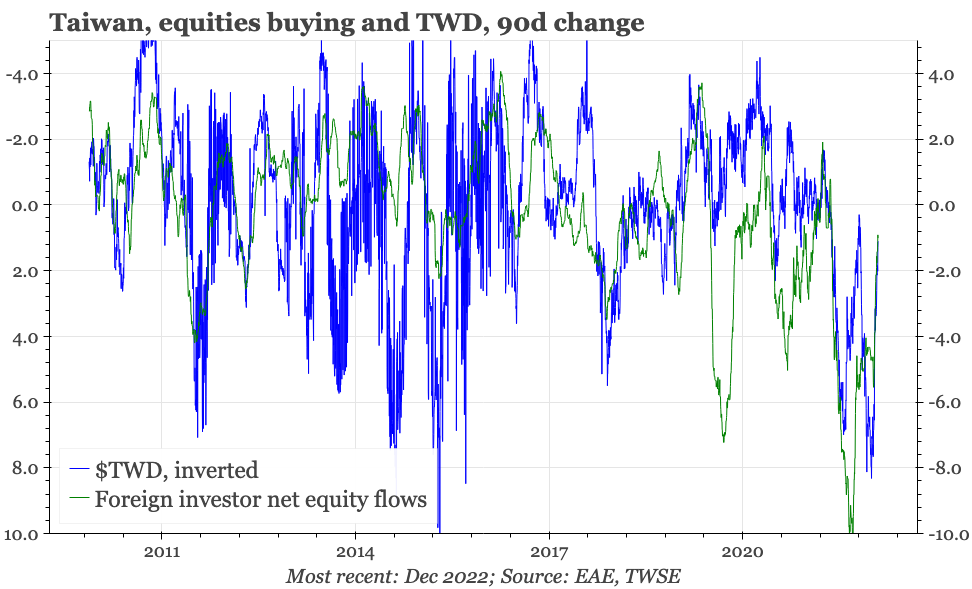 The large external surplus has been an important source of support for the currency in recent years. Arguably, the superior management of the covid pandemic has now added another. Without the need for lockdowns, Taiwan hasn't had to resort to the sort of extreme fiscal largesse that has been so common elsewhere. As a result, IMF data show that Taiwan's public sector debt coming out of the pandemic remains under 30% of GDP, lower than it was before covid first emerged.