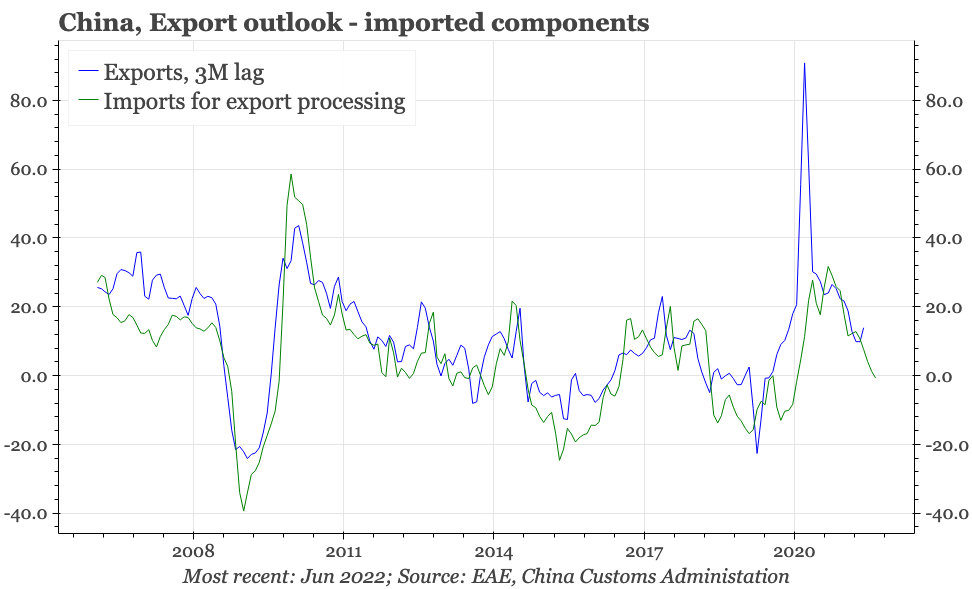 However, growth in exports has been slowing in recent months, and leading indicators suggest shipments will be flat-lining by Q4. Indicators for the broader regional export cycle are suggesting the landing could be harder, and a fall in Chinese exports would feel consistent with the normalisation of the pandemic-driven swing in DM consumer demand away from services to goods. In any case, even if exports prove resilient, it is highly unlikely that there will be a repeat of the sort of surge seen in 2020-21, a surge which for the macroeconomy was important in offsetting the contraction in construction.