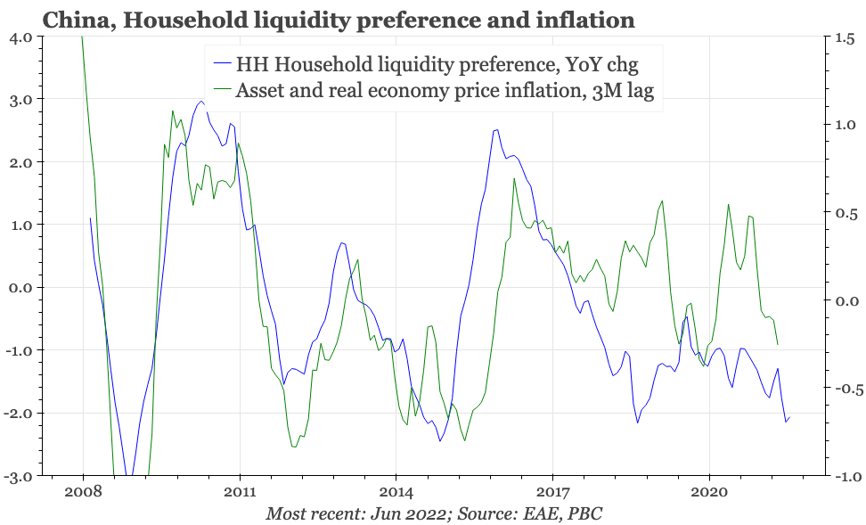 We'll find out a bit more in a few days time when the PBC releases the more detailed monetary data for June, which will include demand deposits of households. That will be an important datapoint in itself, with liquidity preference of households in recent months if anything looking even more bearish than for corporates. In the past, this measure of the savings behaviour of households has been a useful indicator for assessing the likely path for inflation, and for some months now has been flashing warning signs that China is headed for deflation. Such a development wouldn't be supportive for activity.