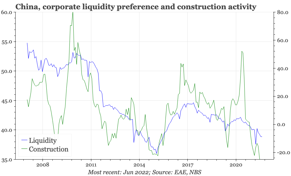 The challenges in property are most acute, with real estate construction in June contracting 40% YoY. End-user demand has shown some signs of recovery: property sales fell a bit less quickly in June, and official data show property prices stabilising. But the continued financial crisis enveloping the developer sector doesn't suggest that property construction is going to respond even if the recovery on the demand side continues. After their near-death experience of the last few months, if companies do start seeing higher revenues, they are more likely to use the money to fortify their balance sheets. It is highly probable that the construction contracts in 2022 as a whole.