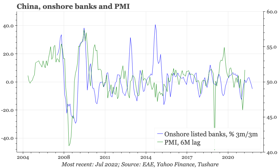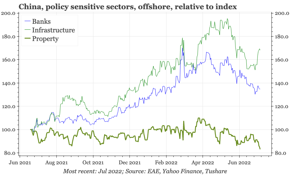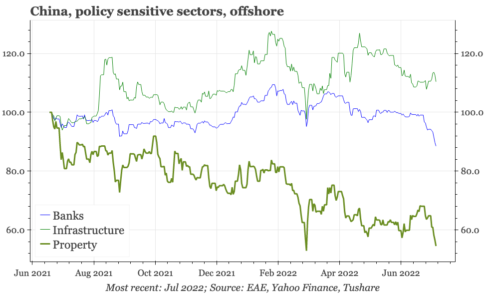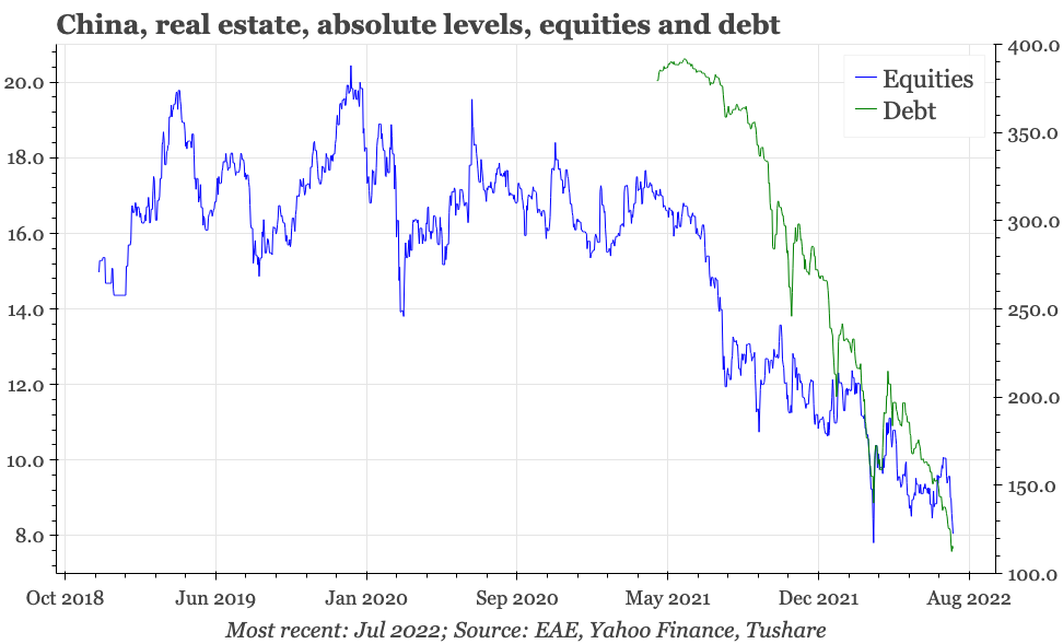 The equity market doesn't suggest much life in any of these three sectors. For property, that isn't new – the sector had already fallen by more than 30% in 2021. But it is important that there is still no stabilisation. Indeed, equity and debt markets are indicating that the pain in the sector is getting ever more intense, with both falling to yet new lows last week; MSCI China real estate is now down a further 25% this year. That is quite striking given officials have been publicly calling for stability in real estate for more than nine months.