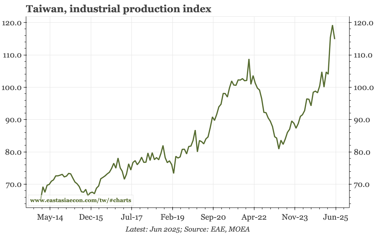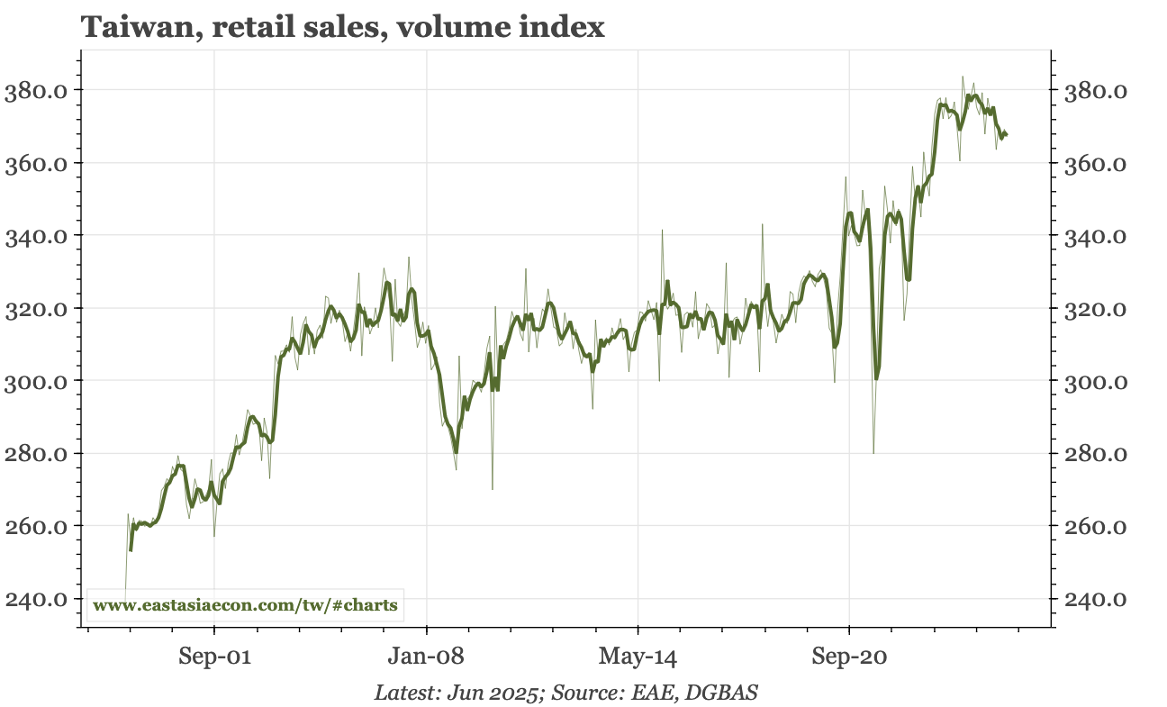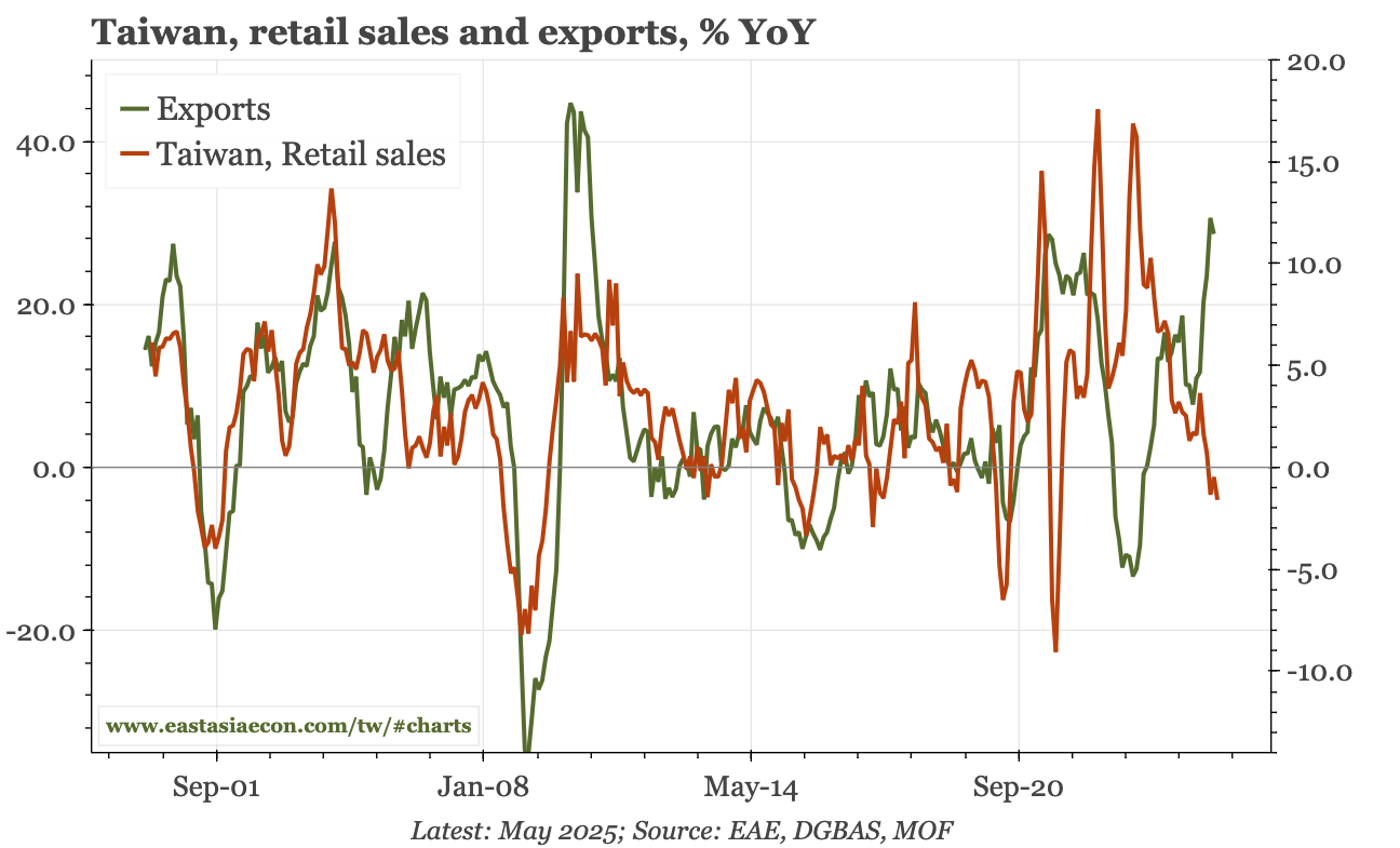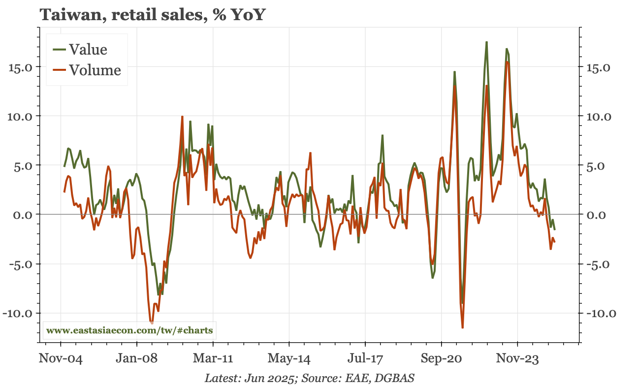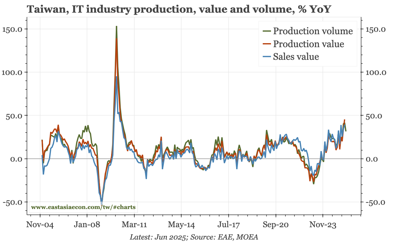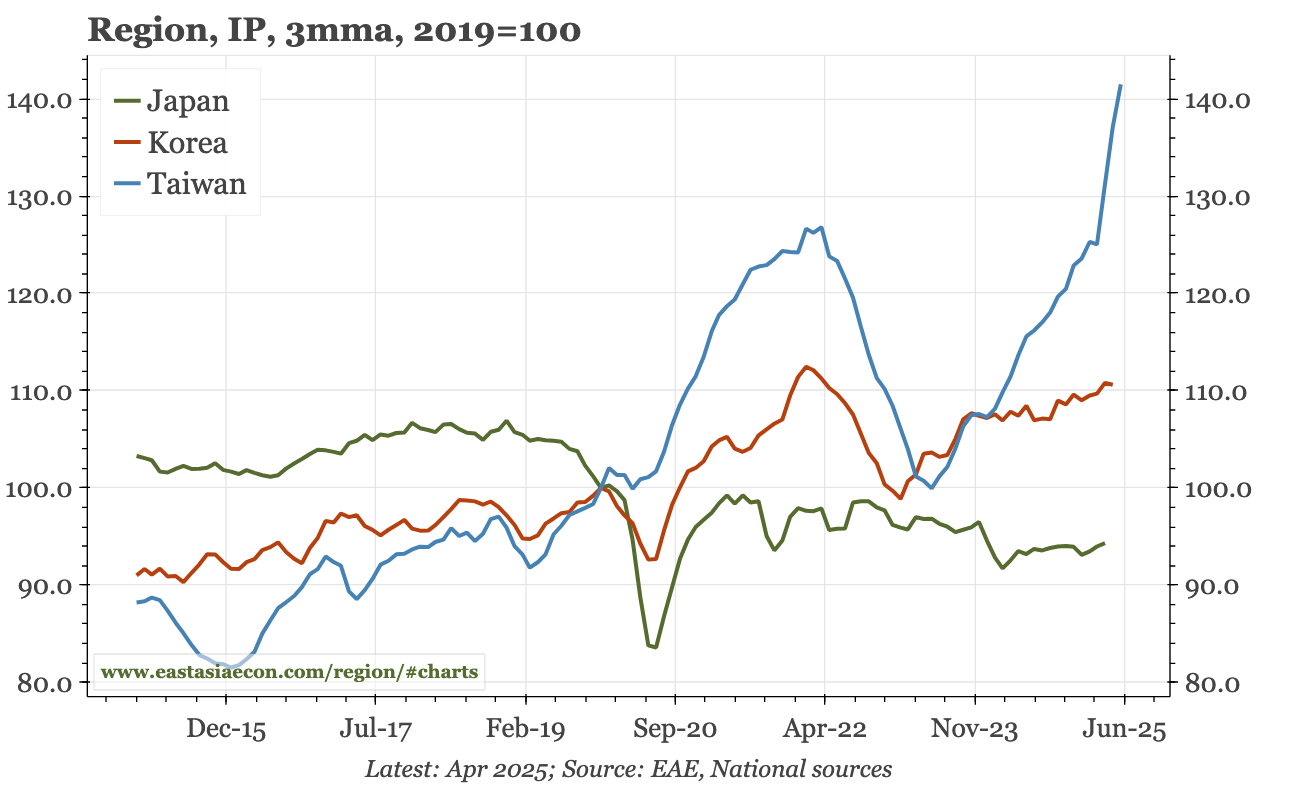 IP dipped in June, but is still 40% above the trough of 2023, 100% higher than 6M ago, and dwarfs the cycle in Korea. The surge in IP/exports has supported the domestic economy when consumption has been weakening. The cycle thus remains unusually desynchronised, as it has been since the pandemic.