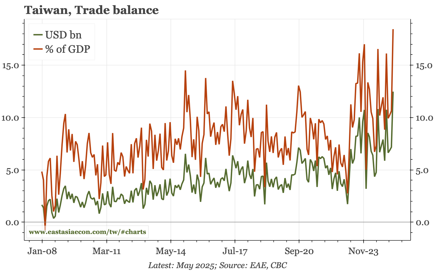 The sharp reversal in exports expected by the government isn't showing up yet. Shipments rose strongly again in May, and are now 17% higher than in December. With imports weaker last month, the trade surplus increased to near 20% of GDP, a new multi-decade high. The biggest driver remains the US.