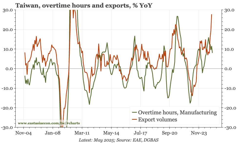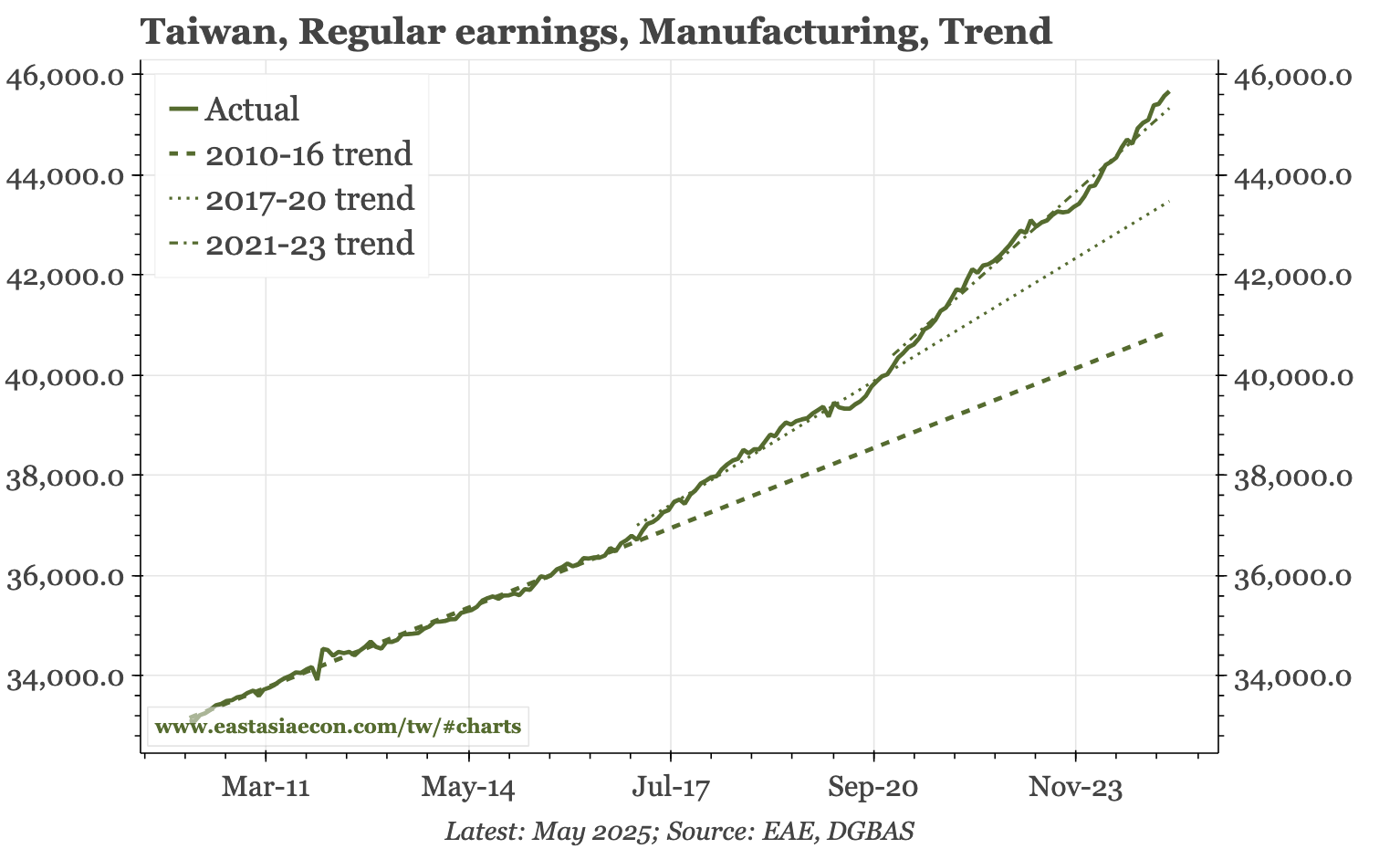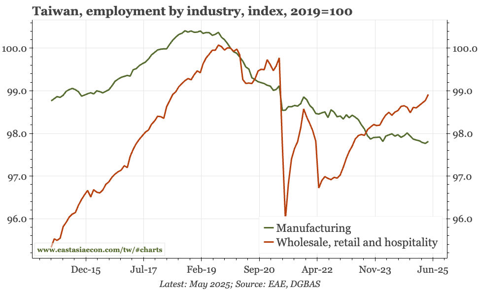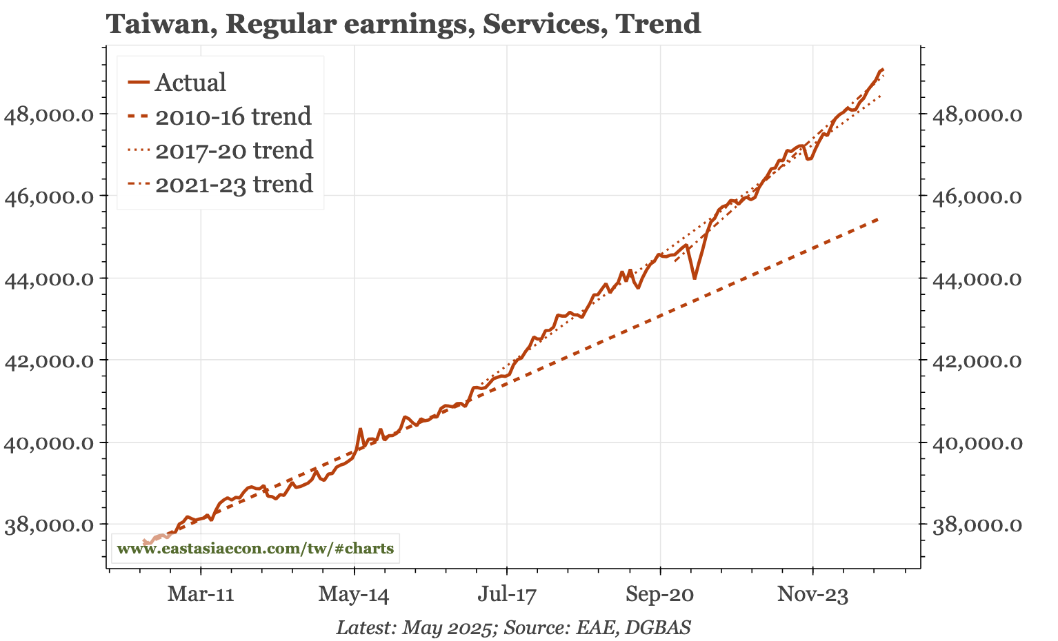 Wage growth slowed in May in manufacturing, but the trend is still up, and in recent months it has been firm in services too. That CPI is slowing is partly due to the TWD, and partly productivity. In separate news, TSMC's sales were softer in June, but financial markets don't seem concerned.